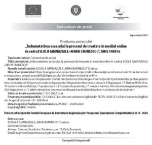 Îmbunatatirea accesului la procesul de învățare în mediul online în cadrul Școlii Gimnaziale „Mihai Eminescu” -Cod My SMIS: 144816 Comunicat presă SMIS 144816 diseminare POC